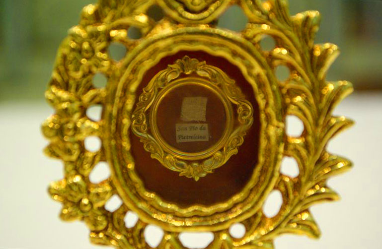 Nella foto in alto la reliquia del Santo Frate, un pezzettino di pezzuola con la quale Padre Pio astergeva le stigmate.