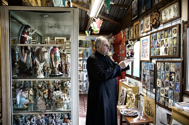 Don Marcello ci fa da guida all’interno della mostra da lui allestita: centinaia e centinaia di statuette, quadri, icone, immagini che raffigurano gli Angeli nella loro costante presenza accanto agli esseri umani.