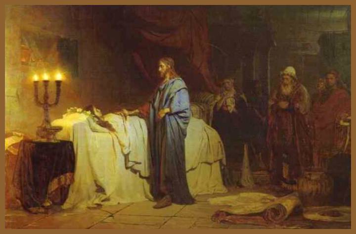 Giunsero alla casa del capo della sinagoga ed egli vide trambusto e gente che piangeva e urlava forte. Entrato, disse loro: «Perché vi agitate e piangete? La bambina non è morta, ma dorme». E lo deridevano. Ma egli, cacciati tutti fuori, prese con sé il padre e la madre della bambina e quelli che erano con lui ed entrò dove era la bambina. Prese la mano della bambina e le disse: «Talità kum», che significa: «Fanciulla, io ti dico: àlzati!». E subito la fanciulla si alzò e camminava; aveva infatti dodici anni. Essi furono presi da grande stupore. E raccomandò loro con insistenza che nessuno venisse a saperlo e disse di darle da mangiare.