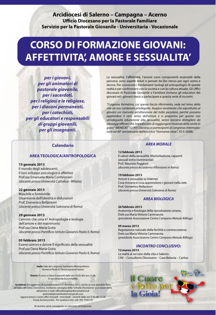 - 15 Gennaio 2012 – inizio Corso di Educazione all’Affettività in collaborazione con l’Ufficio per la Pastorale Giovanile e Vocazionale. Fino al 05 Marzo 2013, tutti i martedì, dalle 19 alle 21, presso il seminario metropolitano