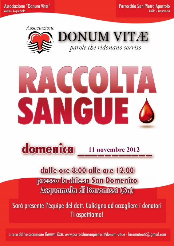 …Perché donare il sangue è tendere una mano invisibile verso chi è nella sofferenza. Domenica 11 novembre 2012 (dalle ore 08.00, alle ore 12.00) presso il centro pastorale san Domenico in Acquamela di Baronissi (SA), a cura dell’equipe medica del…