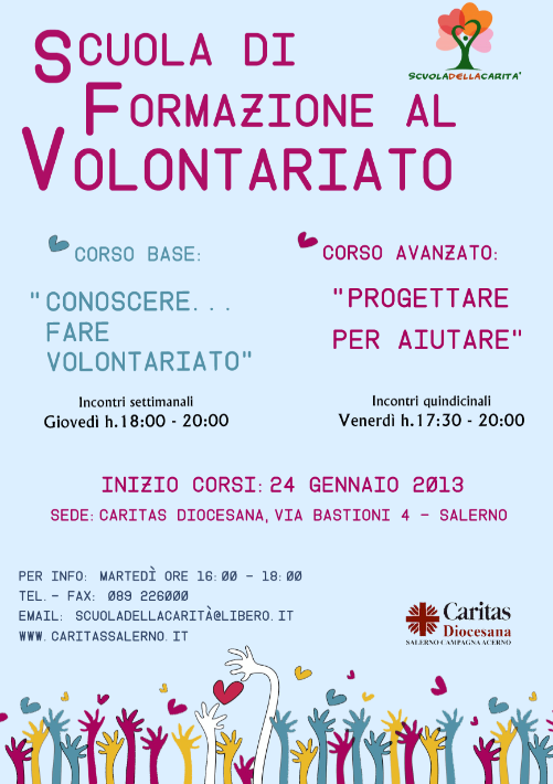 Riceviamo da parte dell’Area Comunicazione della Caritas Diocesana e pubblichiamo integralmente: “Scuola di formazione al VOLONTARIATO” da giovedì 24 gennaio 2013 ore 18.00 presso la Caritas Diocesana via Bastioni 4 Salerno “La scuola nell’antica Grecia, era definita come il luogo…